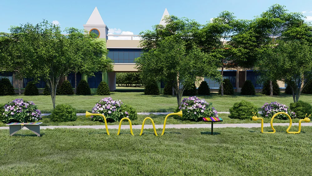 A placa de parede musical da Percussion Instruments é um produto clássico de Hank. É totalmente amarelo, com dois tubos de som amarelos em forma de formiga para as crianças brincarem livremente.